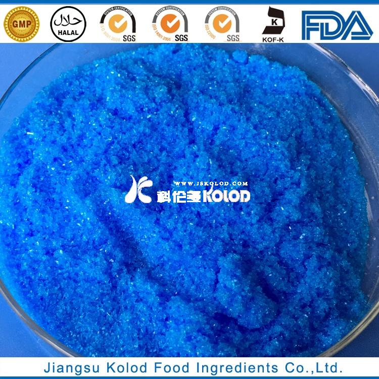 五、性狀:深藍色三斜晶體或藍色結晶性顆粒或粉末。具有令人厭惡的金屬味。干燥空氣中緩慢風化。相對密度2.284。高于150℃形成白色易吸水的無水硫酸銅。于650℃分解成氧化銅。易溶于水(26.3g/100g,20℃),呈酸性,0.1mol/L水溶液的pH值為4.17(15℃)。易溶于甘油,溶于稀乙醇,不溶于無水乙醇。
