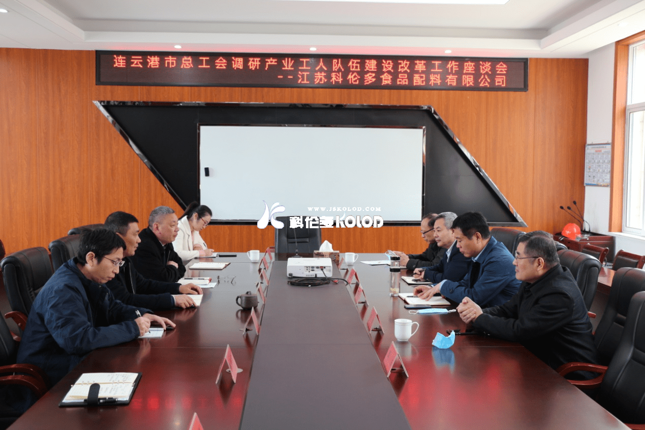 2020年4月14日,連云港市總工會黨組書記、副主席丁維杰帶領(lǐng)市總工會相關(guān)領(lǐng)導(dǎo)一行8人,蒞臨江蘇科倫多食品配料有限公司,調(diào)研產(chǎn)業(yè)工人隊伍建設(shè)改革工作座談會,灌云縣總工會主席徐順達(dá)陪同調(diào)研。首先由科倫多董事長封寬裕進(jìn)行匯報,通過公司人才隊伍建設(shè)、人員福利待遇、員工保障、公司長期規(guī)范建設(shè)等多個方面進(jìn)行了匯報,隨后丁書記表示,科倫多公司在工人隊伍建設(shè)這塊是走在全市民營企業(yè)前列的,保障了員工利益,同時也貢獻(xiàn)了社會,公司制度完善,政治站位極高,希望公司有序推進(jìn),取得更高的進(jìn)展。