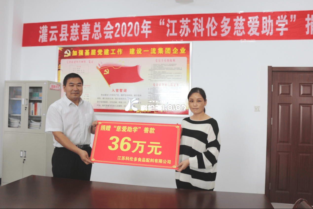 2020年9月25日下午, 2020年“江蘇科倫多慈愛助學”捐贈儀式在科倫多舉行,灌云縣慈善總會會長孫汝軍出席活動。江蘇科倫多食品配料有限公司今年計劃捐贈慈愛助學資金約175萬元,此次捐款36萬元,共捐助70名困難大學生和32名困難高中生。本次活動在灌云報、今日灌云等媒體上進行報道。