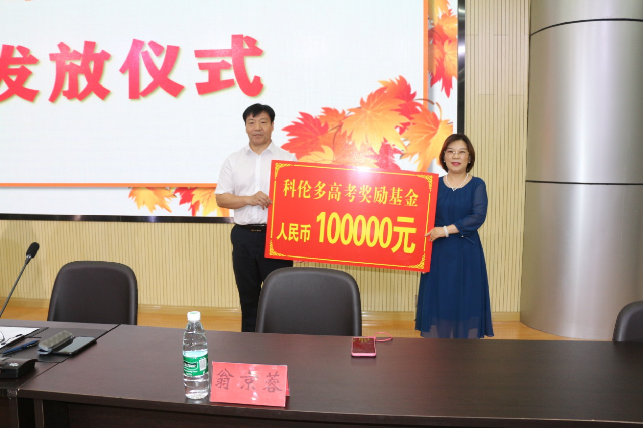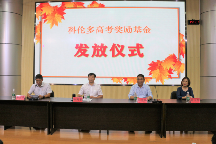 江蘇科倫多董事長封寬裕先生代表集團六百多名員工向長期戰斗在教育一線的教師們表示崇高的敬意和衷心的感謝,副董事長翁京蓉女士代表集團捐贈高考獎勵基金10萬元,專項用于獎勵灌云縣高級中學教師為家鄉教育事業默默耕耘的貢獻。