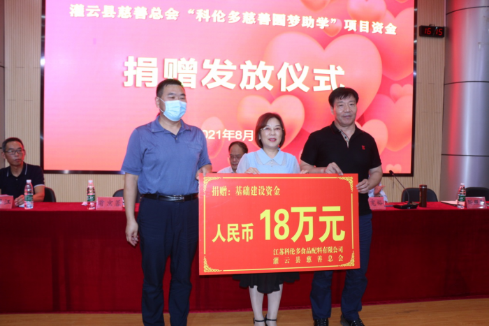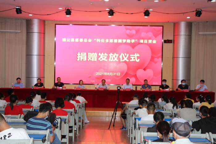 8月31日,2021年度“科倫多慈善圓夢助學”項目在灌云高級中學報告廳舉行捐贈發放儀式,灌云縣副縣長周建軍及慈善總會、民政局、教育局等相關領導出席,現場副董事長翁京蓉女士向灌云縣慈善總會捐贈36萬元用于考上大學的貧困學生專項助學資金,向灌云高級中學捐贈18萬元用于學校的基礎建設。