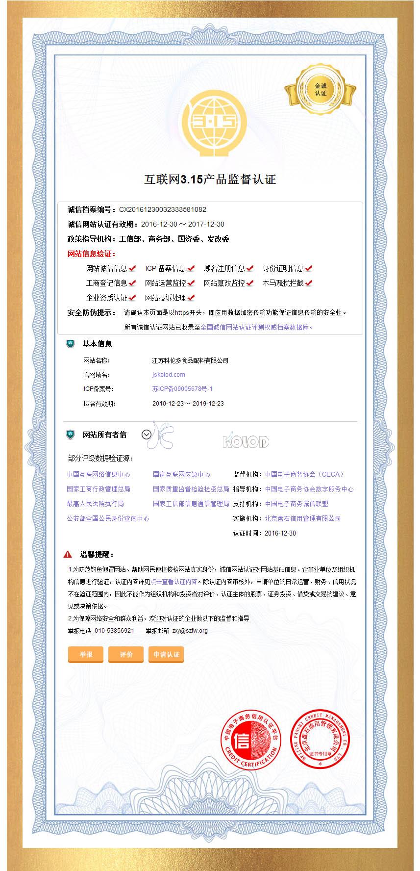 科倫多通過了中國(guó)互聯(lián)網(wǎng)絡(luò)信息中心、國(guó)家互聯(lián)網(wǎng)應(yīng)急中心國(guó)家工商行政管理總局、國(guó)家質(zhì)量監(jiān)督檢驗(yàn)檢疫總局最高人民法院執(zhí)行局、國(guó)家工信部電信管理局、公安部全國(guó)公民身份查詢中心的評(píng)級(jí)驗(yàn)證。中國(guó)電子商務(wù)協(xié)會(huì)(CECA)的監(jiān)督,在中國(guó)電子商務(wù)協(xié)會(huì)數(shù)字服務(wù)中心的指導(dǎo)下,被成功收錄進(jìn)入中國(guó)電子商務(wù)誠(chéng)信聯(lián)盟。并且獲得了誠(chéng)信網(wǎng)站認(rèn)證書。